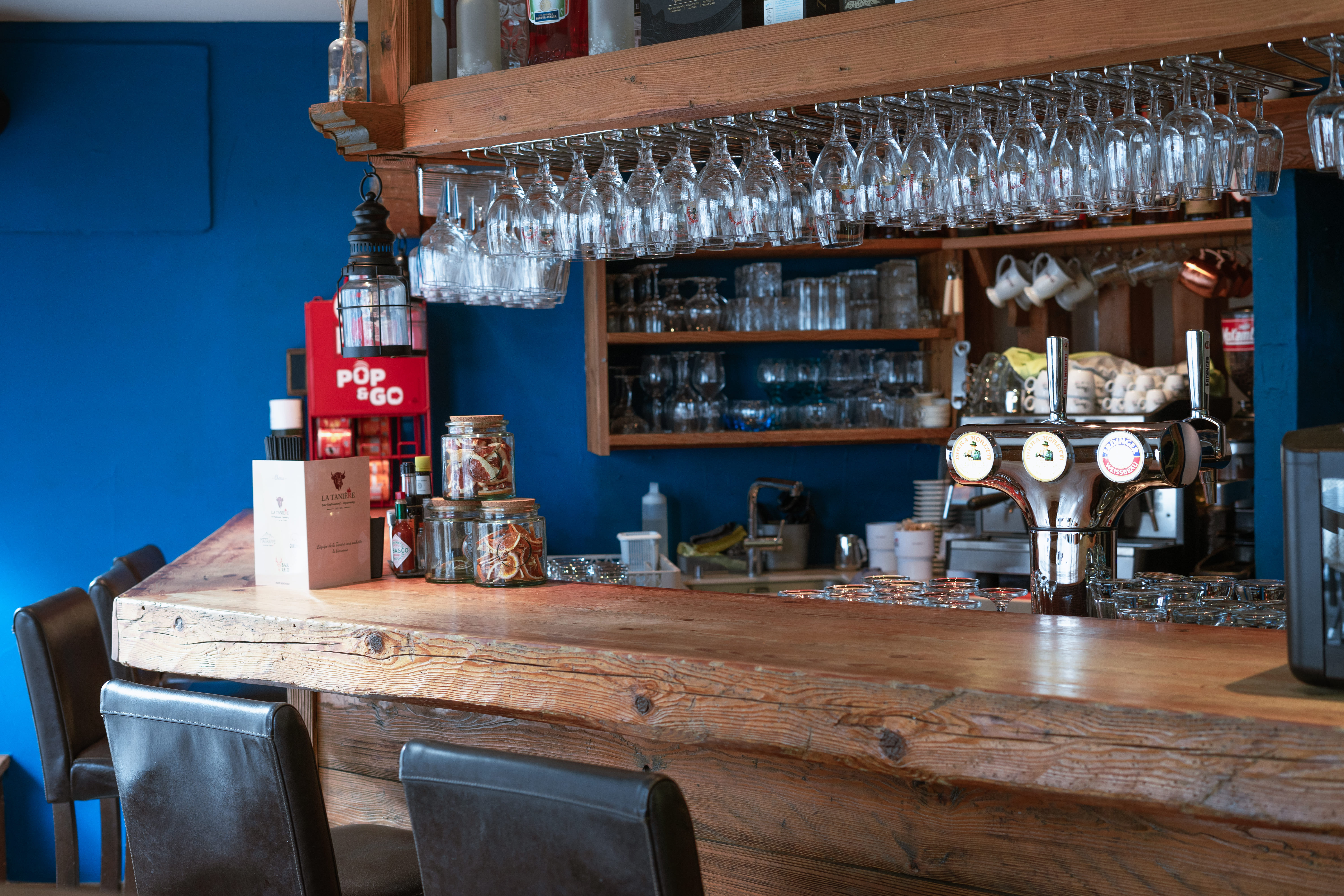 L'espace bar vous accueille pour vos apéros ou pour retirer vos commandes en take away. En hiver, la cabane à raclettes et vin chaud est là pour vous faire passer de bons moments, typiques de ce qui se vivent à la montagne.