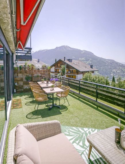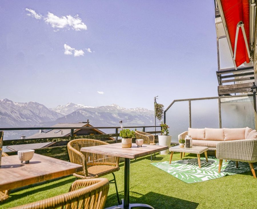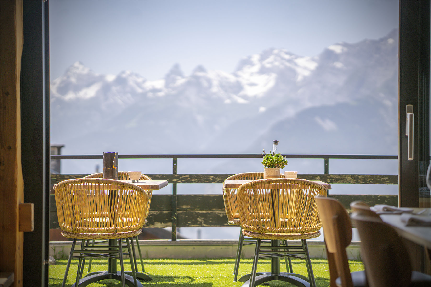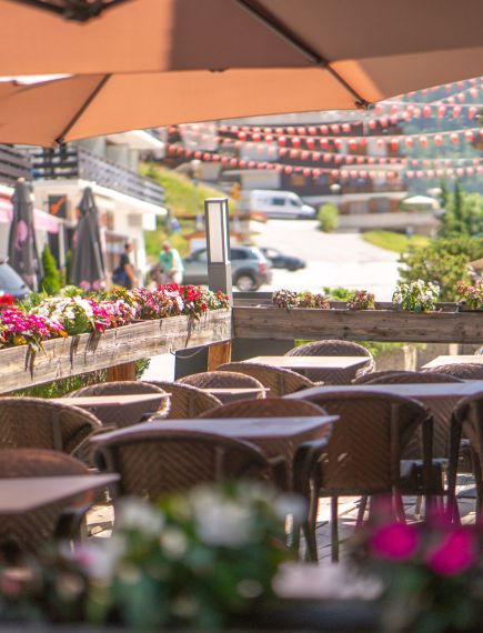 A l'extérieur, nos deux terrasses au centre de la station vous accueillent pour profiter du soleil de Veysonnaz et de sa vue imprenable sur la Vallée du Rhône et les Alpes.